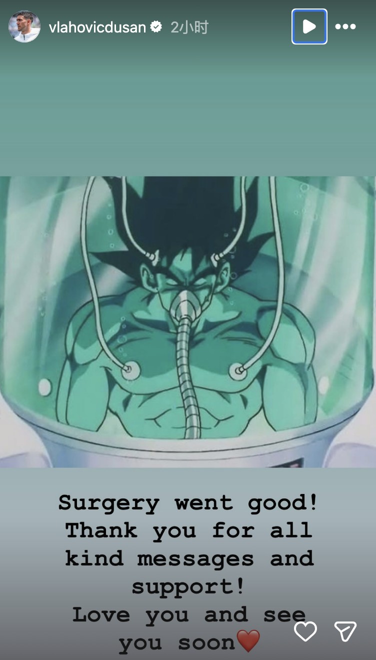 弗拉霍維奇曬龍珠悟空恢復照:手術很順利,感謝大家